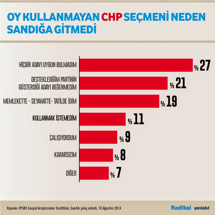 Neticede ne MHP ve CHP tabanında, ne Gezi dahil gençlik kuşağında ve ne de kadın seçmenler arasında yeterli heyecan ve motivasyon yaratılamadı. Dolayısıyla da, 5 milyona yakın seçmen sandık başına gitmek için yeterli bir neden bulamadı.