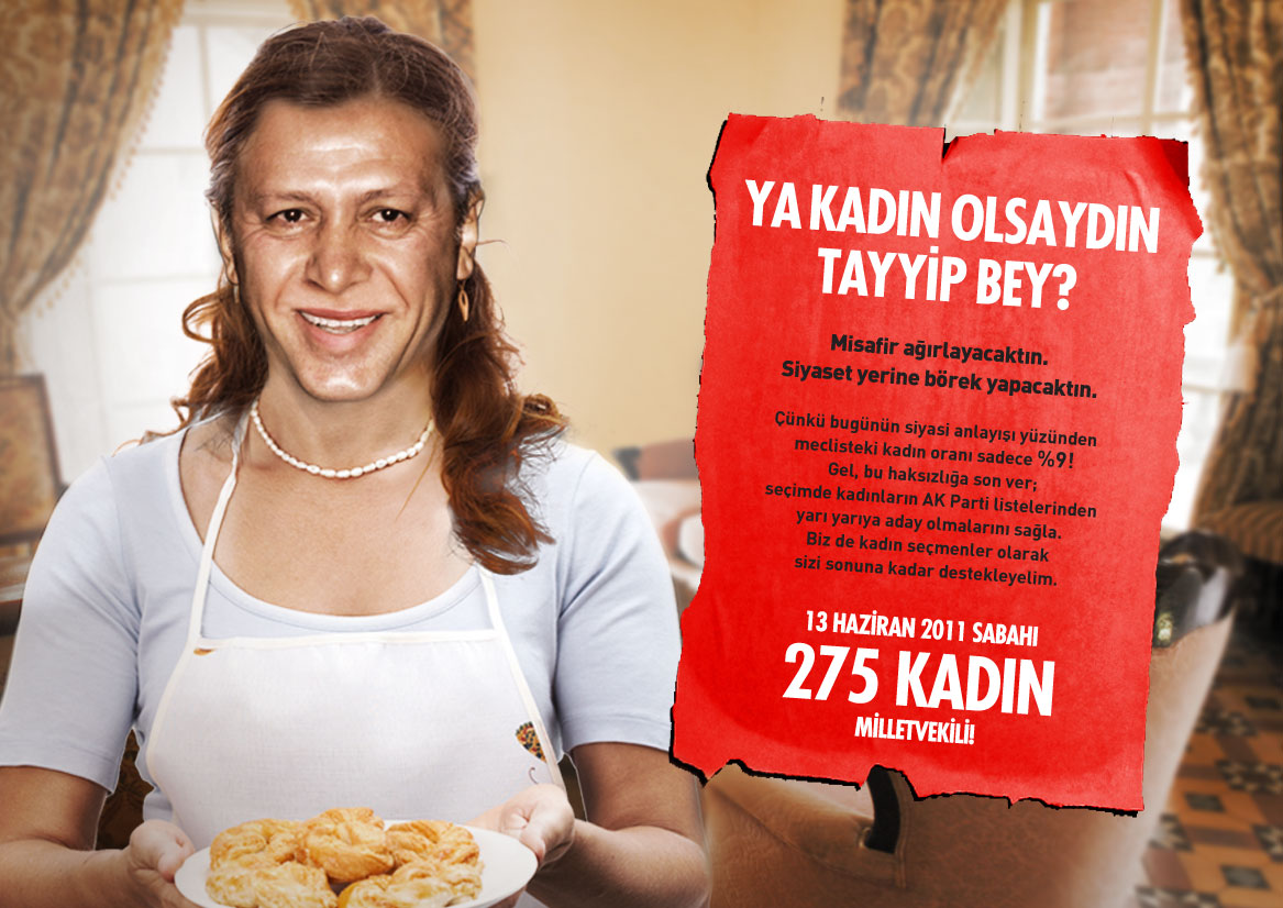 İlk ilanda, Adalet ve Kalkınma Partisi Genel Başkanı ve Başbakan Recep Tayyip Erdoğan’a soruyorum:“Ya kadın olsaydın Tayyip Bey? Misafir ağırlayacaktın, siyaset yerine börek yapacaktın.”